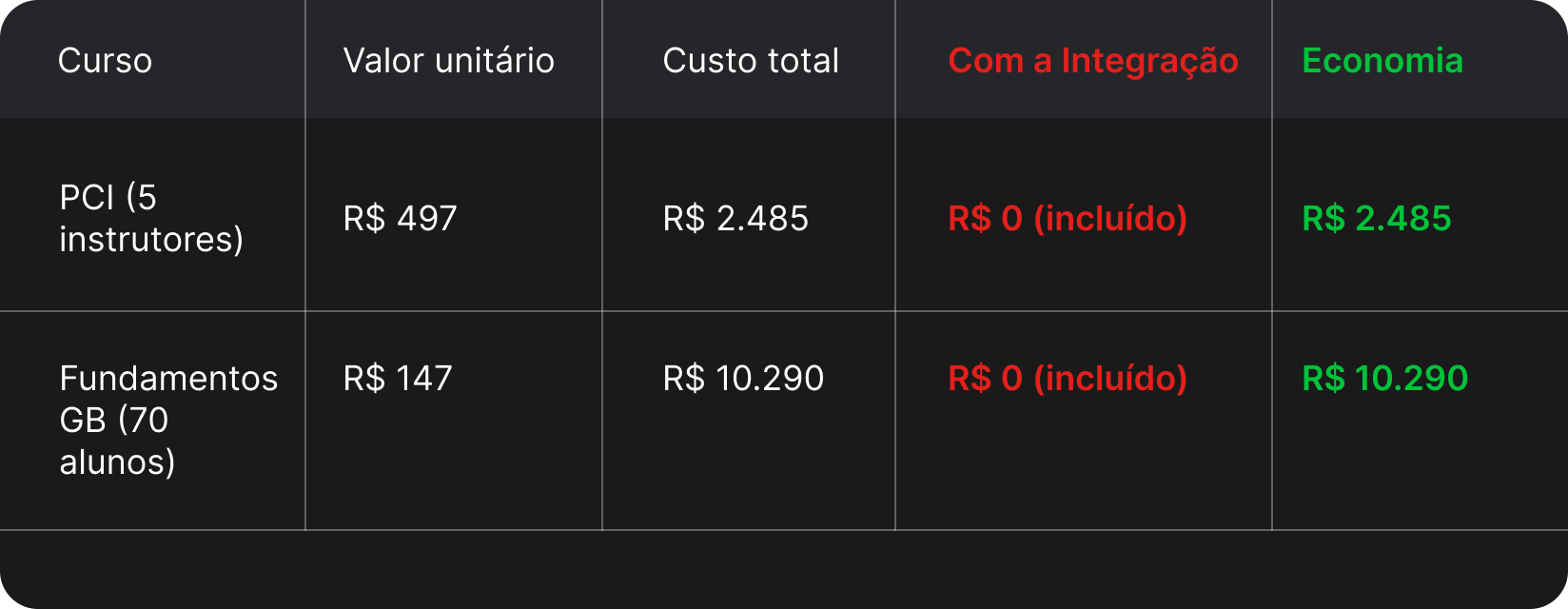Resultado: Economia de R$ 2.485 no PCI e de R$ 10.290 no Fundamentos GB.